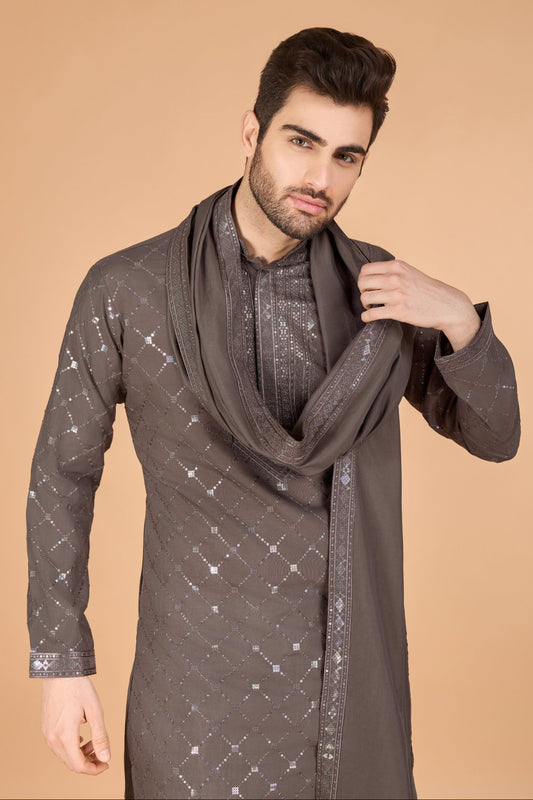 Brown Multi Thread Embroidered Indian Style Kurta Pajama for Festivals