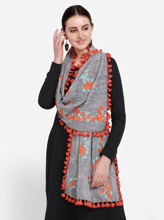Gray Floral Embroidered Pure Khadi Dupatta with Fancy Lace