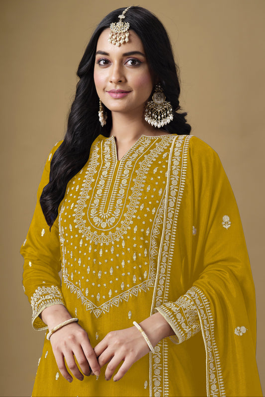 Yellow Color Embroidery Worked Stitched Salwar Kameez Palazzo Dupatta