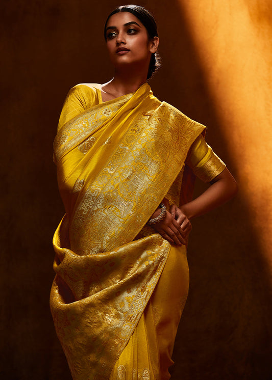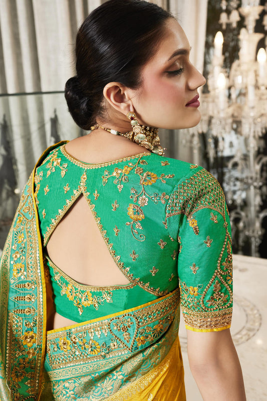 yellow Gadwal Saree with Lemon Silk Blouse for Wedding & Sangeet