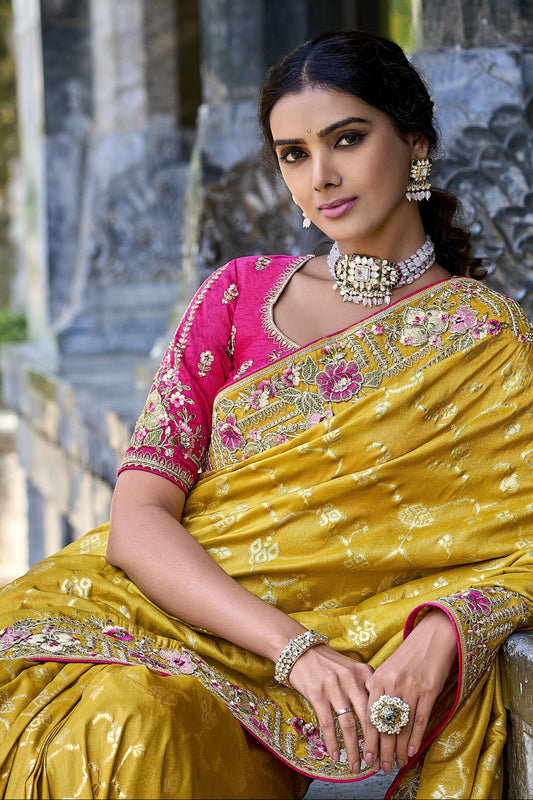 Yellow traditional saree with embroidery and handwork blouse