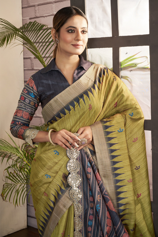 Yellow viscose saree with embroidery and matching silk blouse.