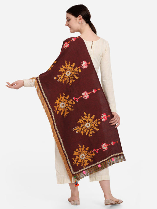 Brown Embroidered & Floral Print Khadi Cotton Dupatta
