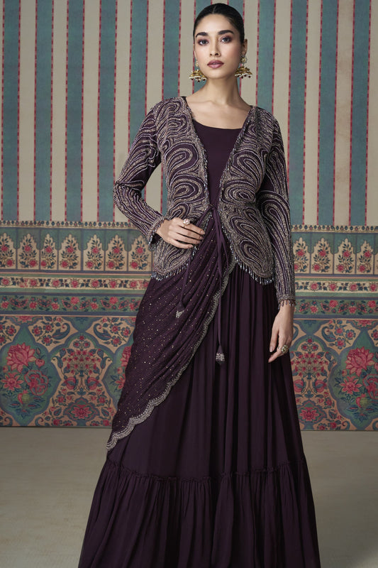 Wedding-Reception Special Dark Purple Color Anarkali Gown Indo-Western