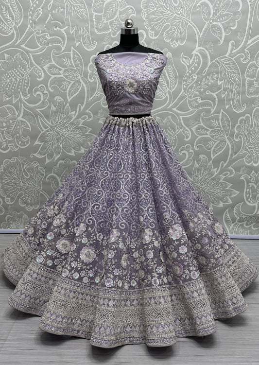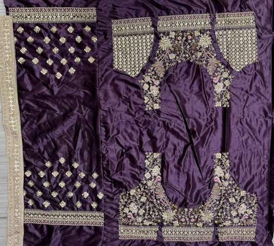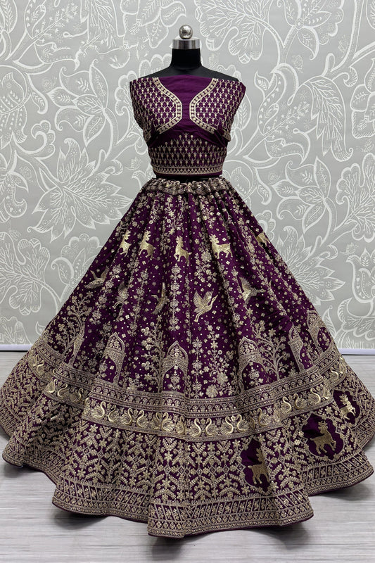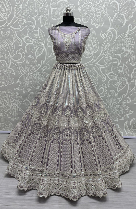 Beautiful purple silk lehenga with heavy embroidery and net dupatta