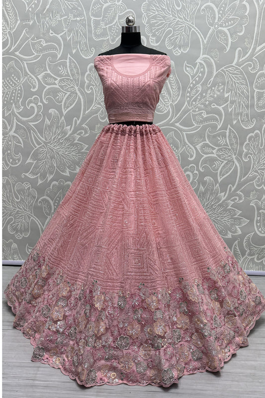 Baby Pink Net Lehenga Choli with Rose Pattern Embroidery Work
