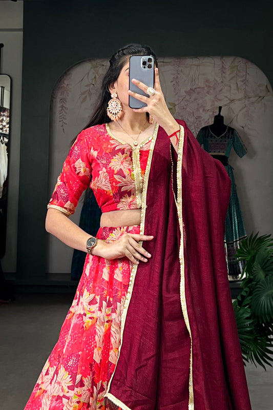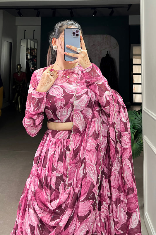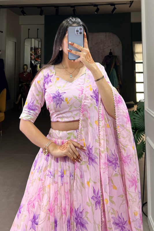 Latest Pink Floral Print Lehenga Choli with Silk Dupatta