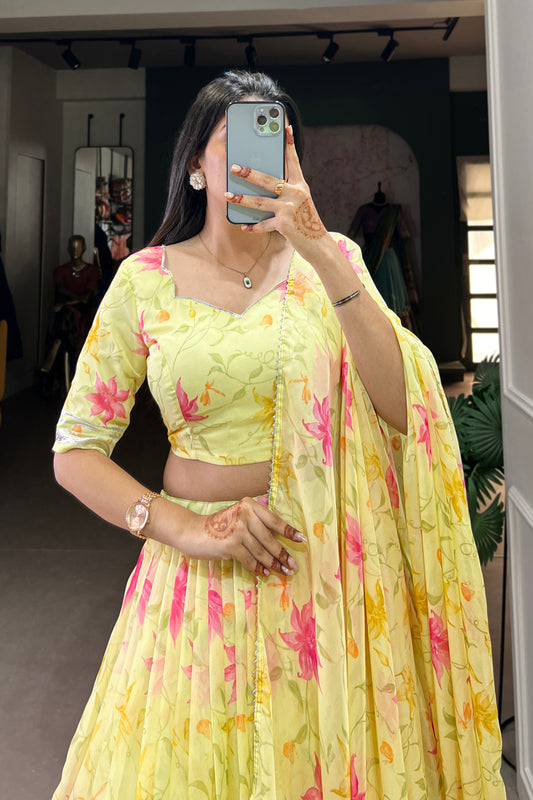 Yellow Floral Print Lehenga Choli with Gorgeous Dupatta for Haldi