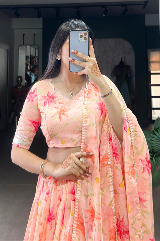 Light Orange Floral Print Lehenga Choli for Traditional Weddings