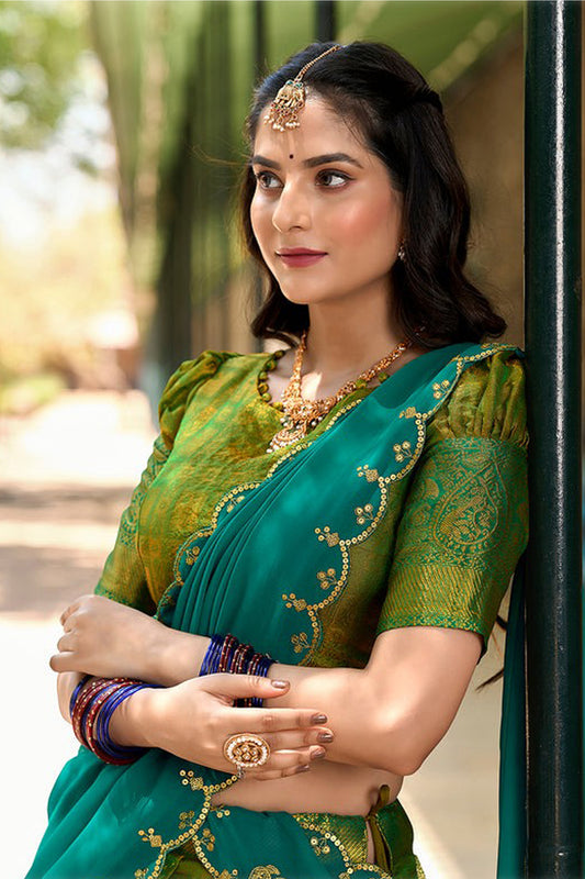 Delicate Style Weaving Work Cyan Color Lehenga For Special Festival