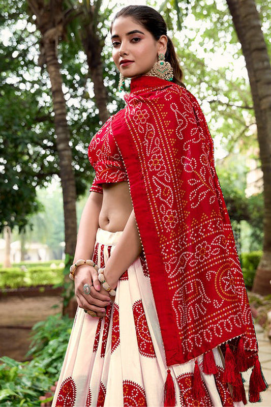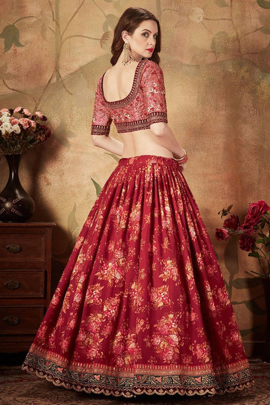Solid Red Color Printed Lehenga With Dupatta For Wedding-Reception