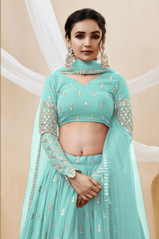 Classic Style Cyan Color Embroidery Work Heavy Lehenga For Wedding