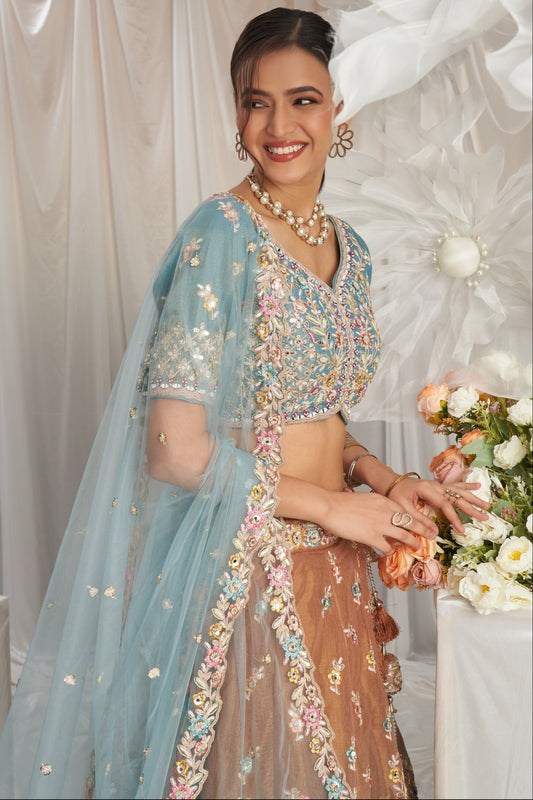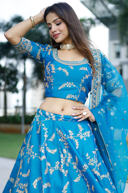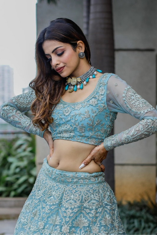 Sky blue ready-to-wear thread embroidery lehenga for wedding festival.