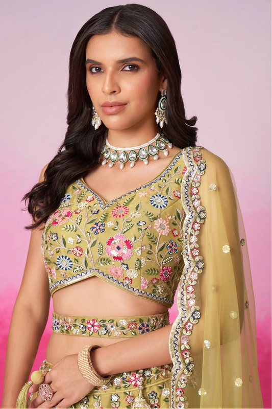 Wedding reception olive green lehenga with multi embroidery