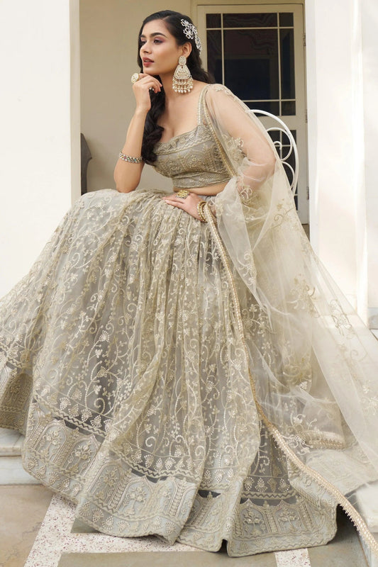 Gray multi embroidery bridal designer lehenga with net dupatta.