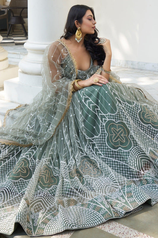 Bollywood green thread work bridal lehenga for wedding reception.