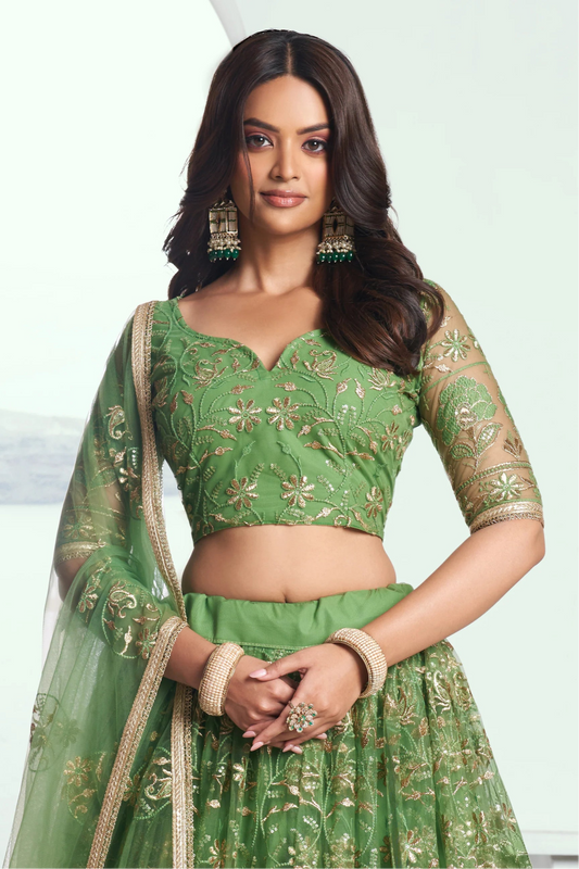 Olive Green Thread Embroidery Luxury Lehenga with Dupatta.