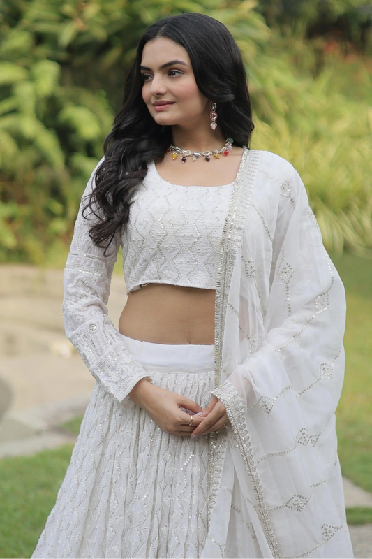 White sequins jacquard lehenga for wedding ethnic wear
