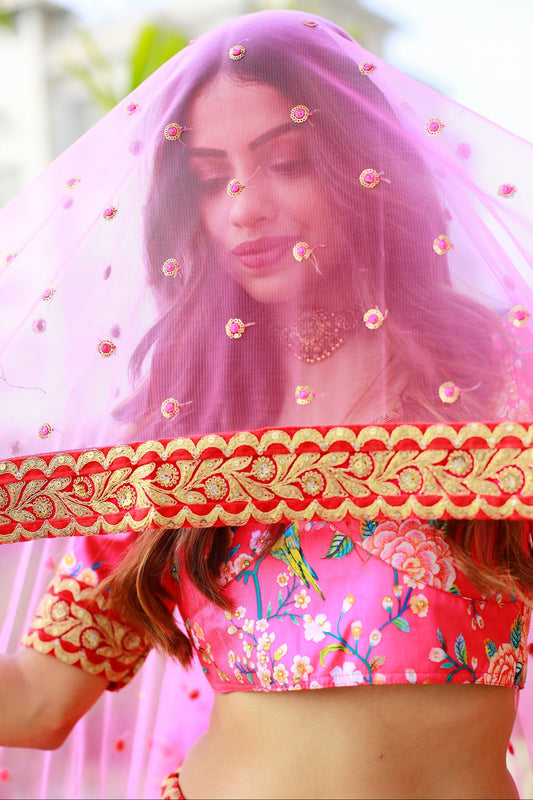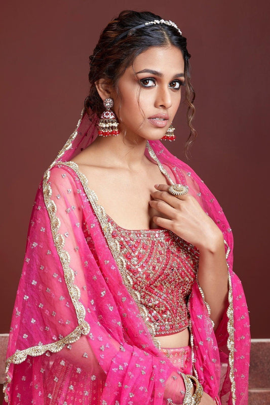 Dark pink bridal lehenga with sequins and net dupatta in Florida.