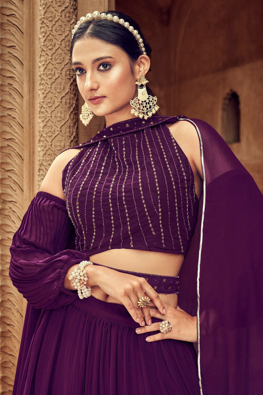 Dark purple georgette multi embroidery luxury modern lehenga.