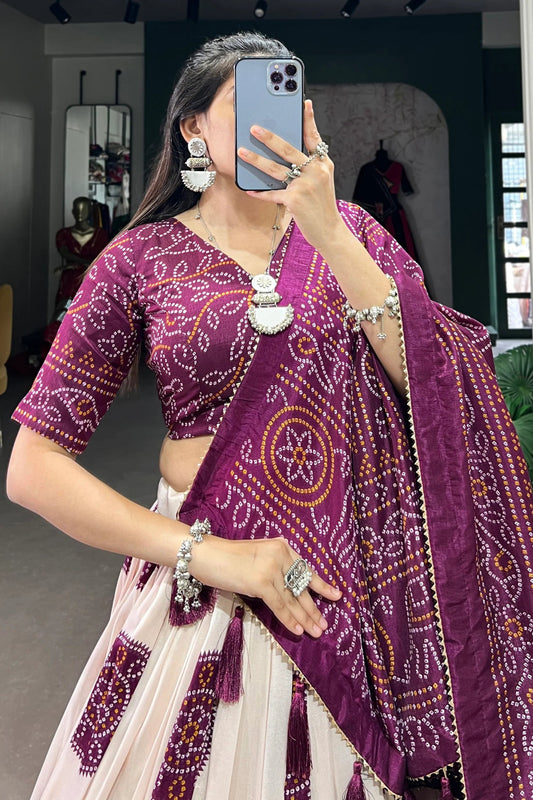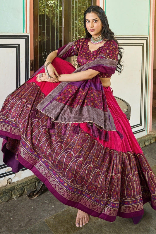 Dark purple printed ready-to-wear lehenga with silk dupatta.