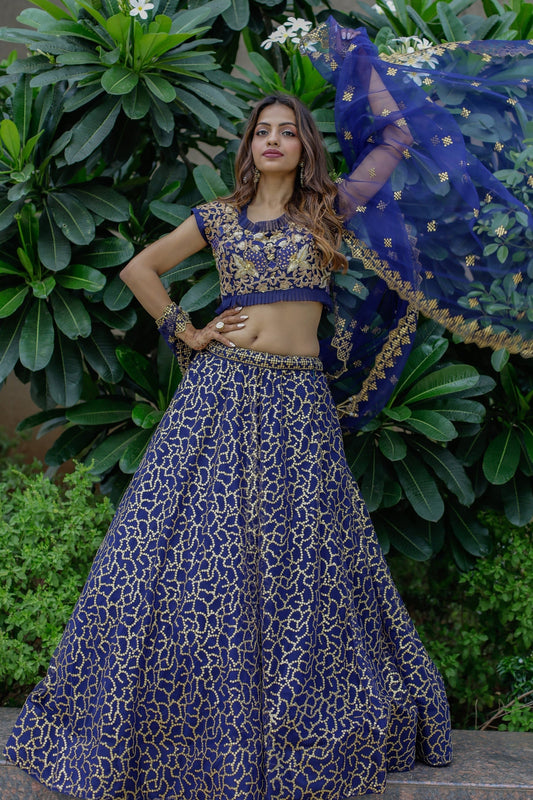 Blue thread embroidery net lehenga with dupatta, ready to wear.