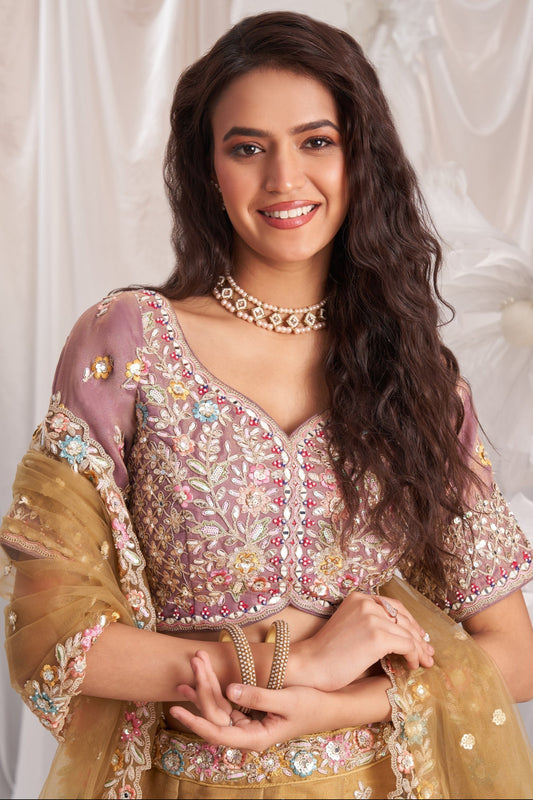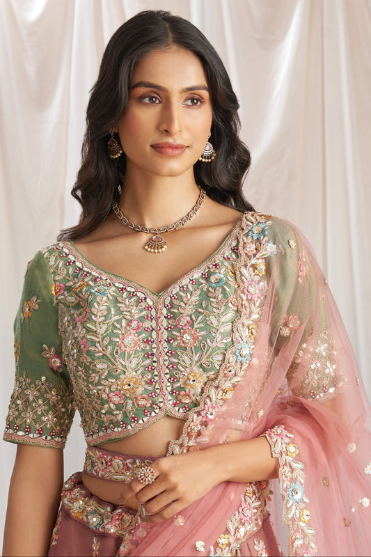 Rosy brown multi embroidery lehenga with dupatta for Diwali.
