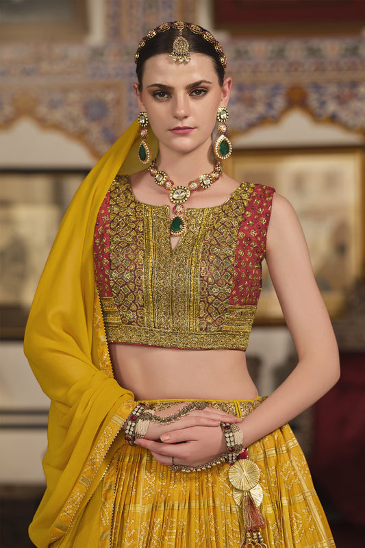 Exclusive yellow lehenga choli suit with zari for weddings