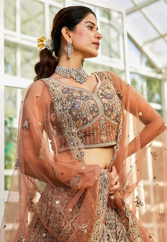 Modern brown lehenga choli with sequins for special weddings