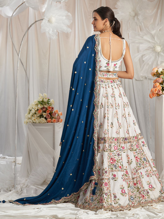 Pakistani white organza lehenga choli with sequins and blue dupatta