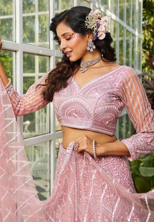 Elegant Pink Sequins Embroidered Lehenga Choli with Net Dupatta