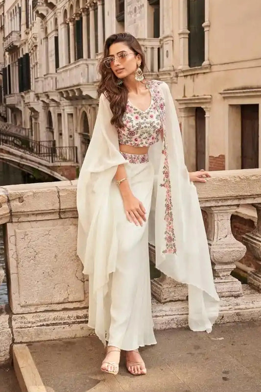 Elegant White Embroidered Shrug Style Palazzo Suit Set