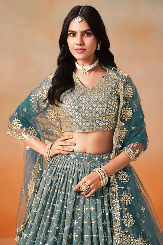 Ethnic Designer Olive Green Georgette Fabric Wedding Wear Lehenga Choli