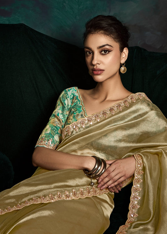 Floral Printed Green Designer Organza Fabric Event Party Wear Saree