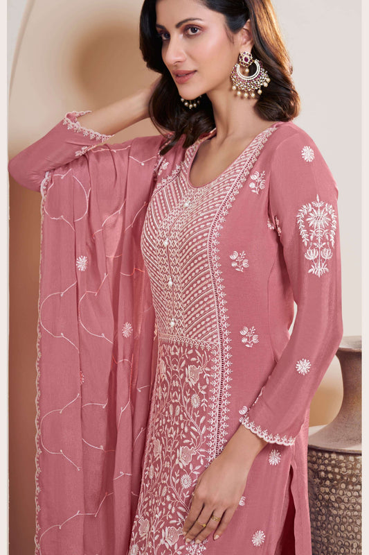 Traditional Pink Chinon Embroidered Salwar Kameez Suits With Dupatta