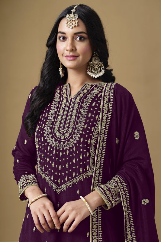 Stunning Purple Chinon Stylish Salwar Kameez With Dupatta Set