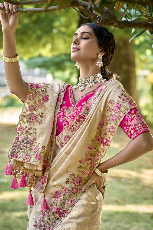 Off-White Gadwal Silk Saree with Pink Rani Blouse & Exquisite Handwork