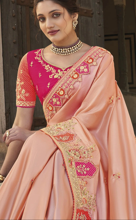 Peach Designer Saree with Fancy Silk Fabric, Handwork & Patchwork