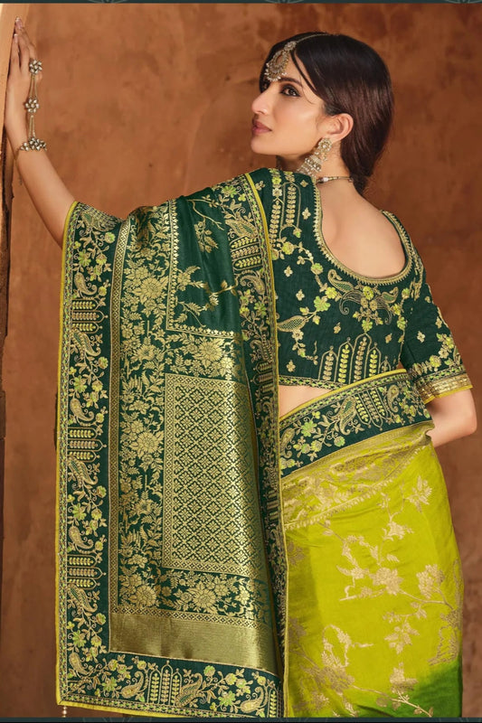 Pista Gadwal silk saree with Rama blouse and handwork.