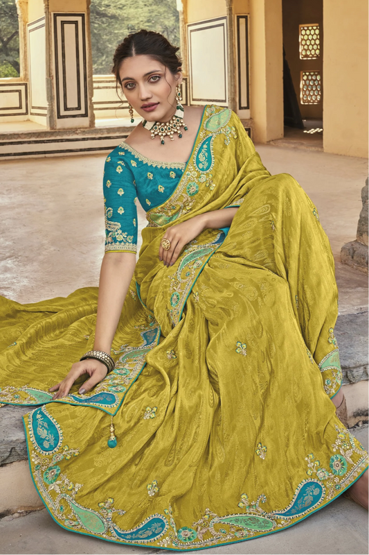 Lemon Designer Traditional Saree with Fabric & Handwork for Engagement