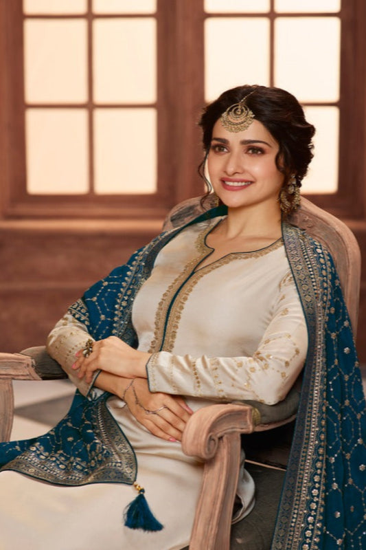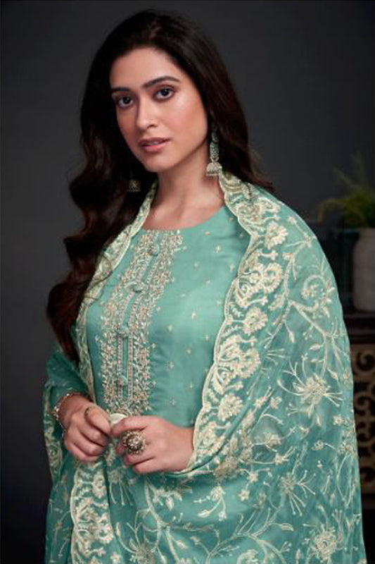 Teal Satin Georgette Salwar Suit with Heavy Embroidered Dupatta