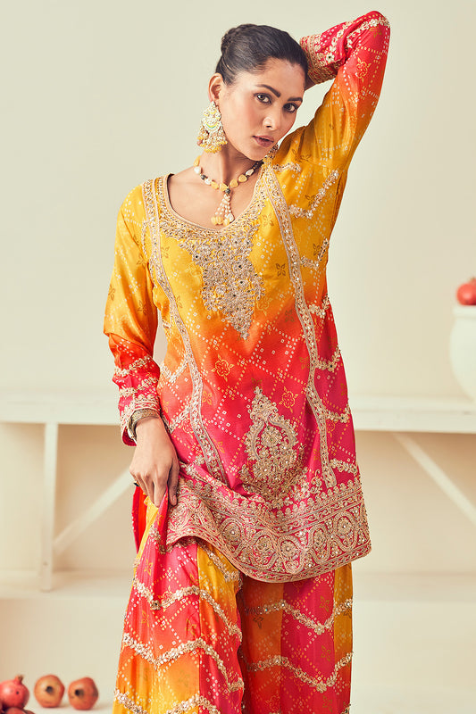 Yellow & Red Embroidered Diwali Palazzo Dress with Latkan Dupatta