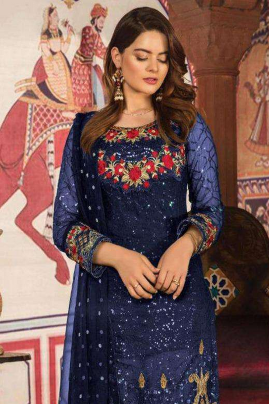 Navy Blue Plus Size Beautiful Embroidery Work Net Fabric Salwar Kameez