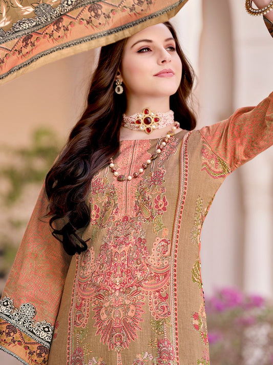 Beautiful Peach Pakistani Kameez Pant With Printed Dupatta
