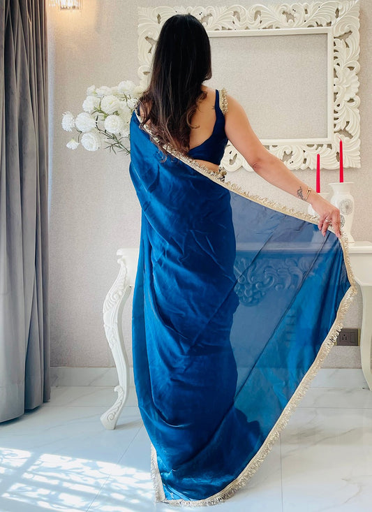 Dark blue satin silk and net saree with sequins—perfect for festivals.