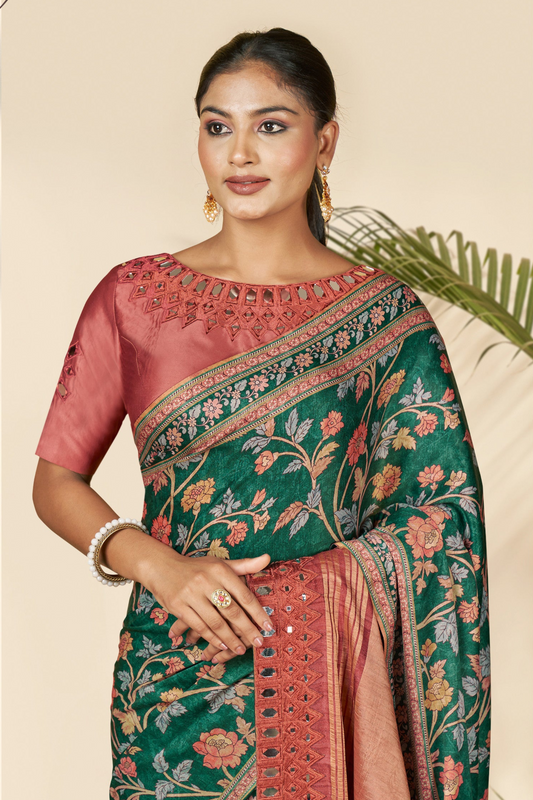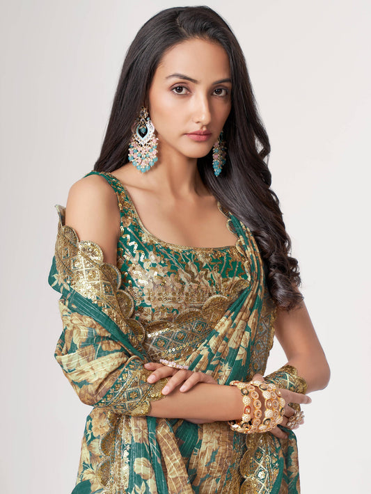 Floral Printed Green Designer Organza Fabric Event Party Wear Saree