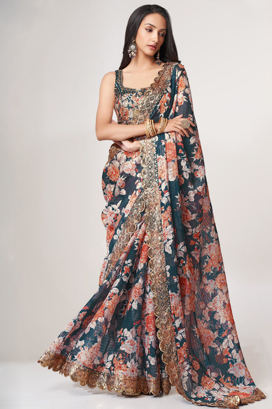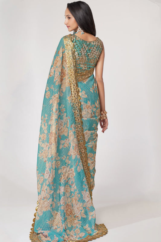 Gorgeous Designer Organza Fabric Blue Color Floral Printed Wedding Party Wear Saree