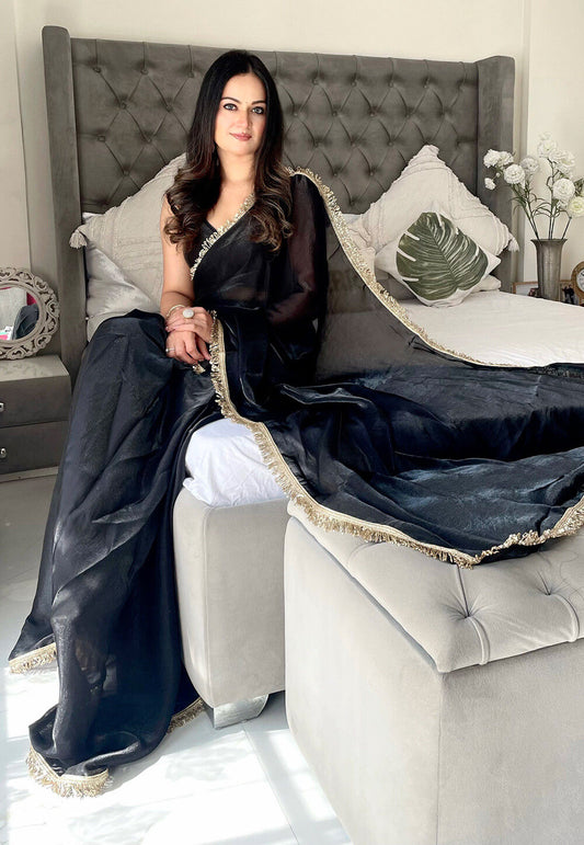 Black Satin Silk Saree with Sleeveless Blouse for Wedding Party