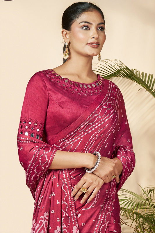Bandhani Print Gaji Silk Saree with Mirror Work & Stitched Blouse