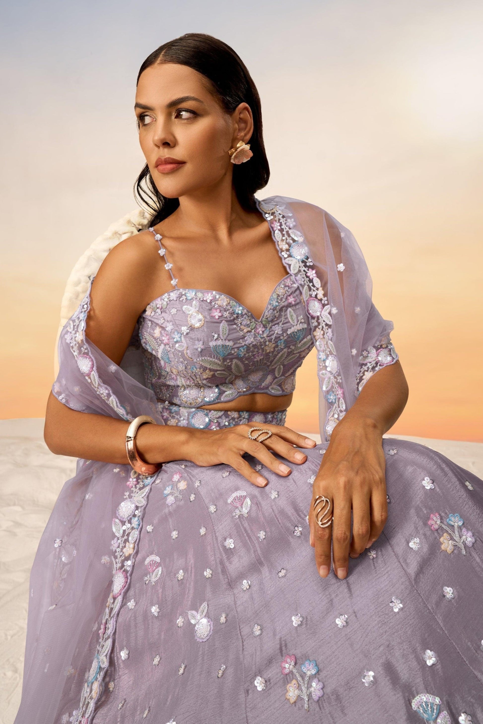 A lehenga in a delicate shade of light purple presents a gentle and romantic allure, rendering it an exquisite option for weddings, receptions, or festive occasions. This soft pastel tone conveys an air of sophistication and femininity, all the while preserving a contemporary and stylish appearance.